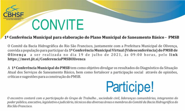 O Comitê da Bacia Hidrográfica do Rio São Francisco, juntamente com a Prefeitura Municipal de Olivença, convida a população para participar da 1º Conferência Municipal Virtual (Videoconferência) do PMSB de Olivença a ser realizada no dia 19 de julho de 2021, às 09:00 horas, pelo link https://meet.jit.si/ConferenciaPMSBOlivenca