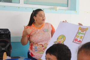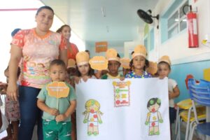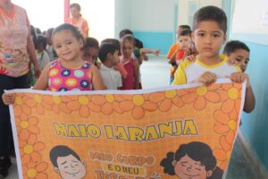 A programação do Maio Laranja também incluiu atividades educativas e lúdicas na Creche CRIA, levando às nossas crianças, de forma leve e pedagógica, o primeiro contato com o tema da proteção e dos direitos da infância.